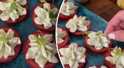 وصفة لوجبة خفيفة بالطماطم لذيذة جدا. تم نسخ الرابط وجبة خفيفة سريعة ستصبح نجمة الطاولة / الكولاج: رئيس التحرير، الصورة: لقطات من الفيديو تعتبر الطماطم